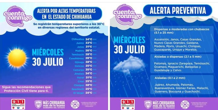 Dispersas a moderadas con chubascos (5.1 a 25 mm) en: Ascensión, Janos, Casas Grandes, Nuevo Casas Grandes, Galeana, Madera, Moris, Uruachi, Chínipas, Guazapares, Urique y Morelos.